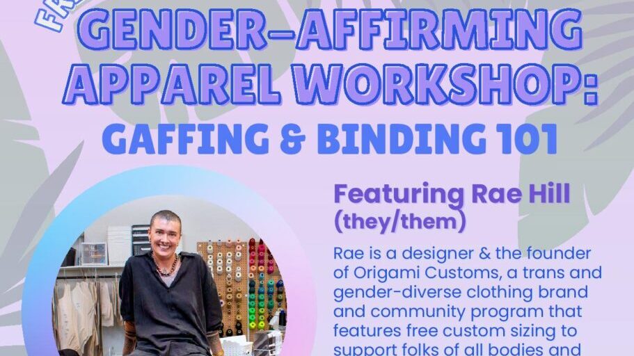 We’re thrilled to have Rae Hill (they/them) as our visiting facilitator! Rae is the creative powerhouse behind Origami Customs, a trailblazing brand specializing in custom-made gender-affirming garments for the trans and queer community. This free event will include a Gaffing/Tucking & Binding 101 workshop led informally by Rae from 6-7pm, followed by a Q&A session. With over 15 years of experience in trans-centred fashion, Rae will share safe gaffing/tucking and binding practices, tips for finding the right garment, advice on preventing discomfort or injury, and guidance on caring for your body while wearing compressive garments such as gaffs and binders.